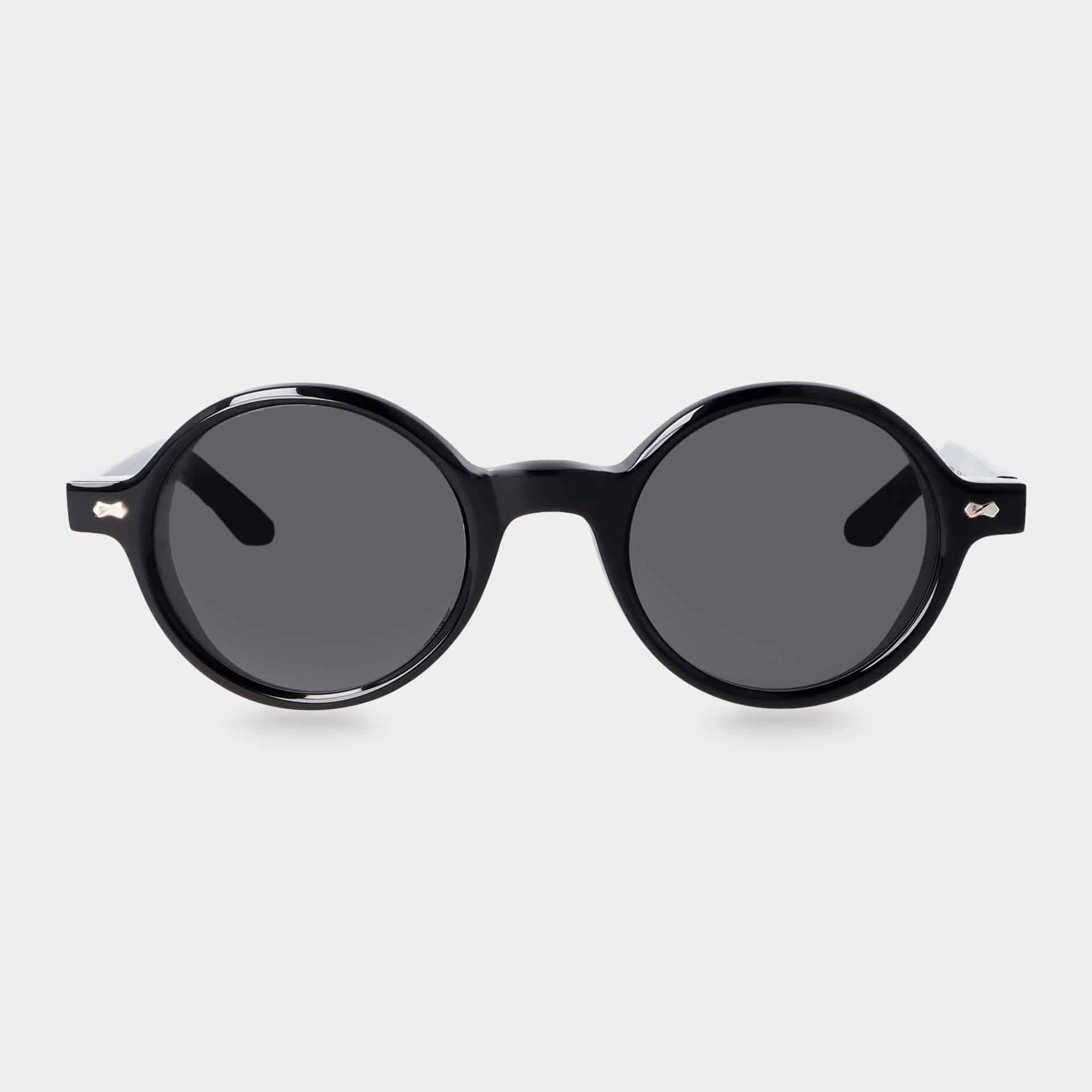A person wearing Giotto Eco Black sunglasses in sustainable bio-acetate, featuring Grey lenses by TBD Eyewear, handmade in Italy. A person wearing Giotto Eco Black sunglasses in sustainable bio-acetate, featuring Grey lenses by TBD Eyewear, handmade in Italy.