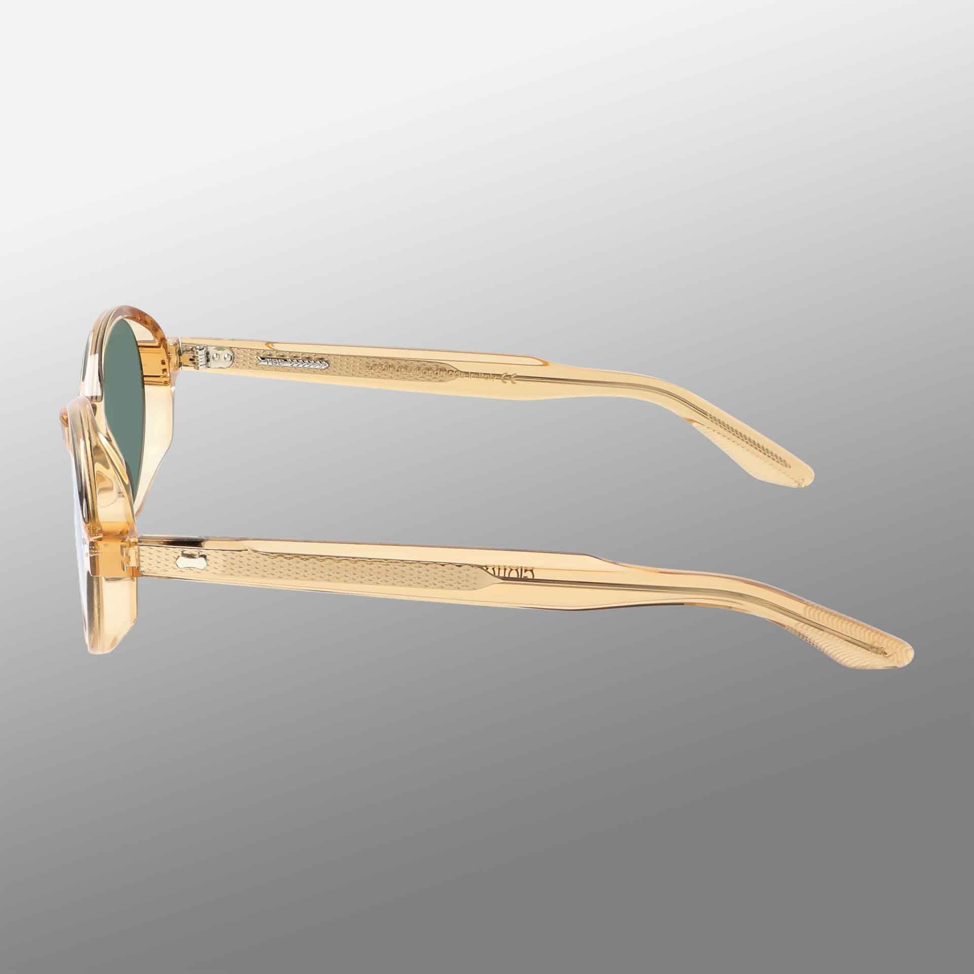 - Light champagne-tone frame paired with bottle-green lenses