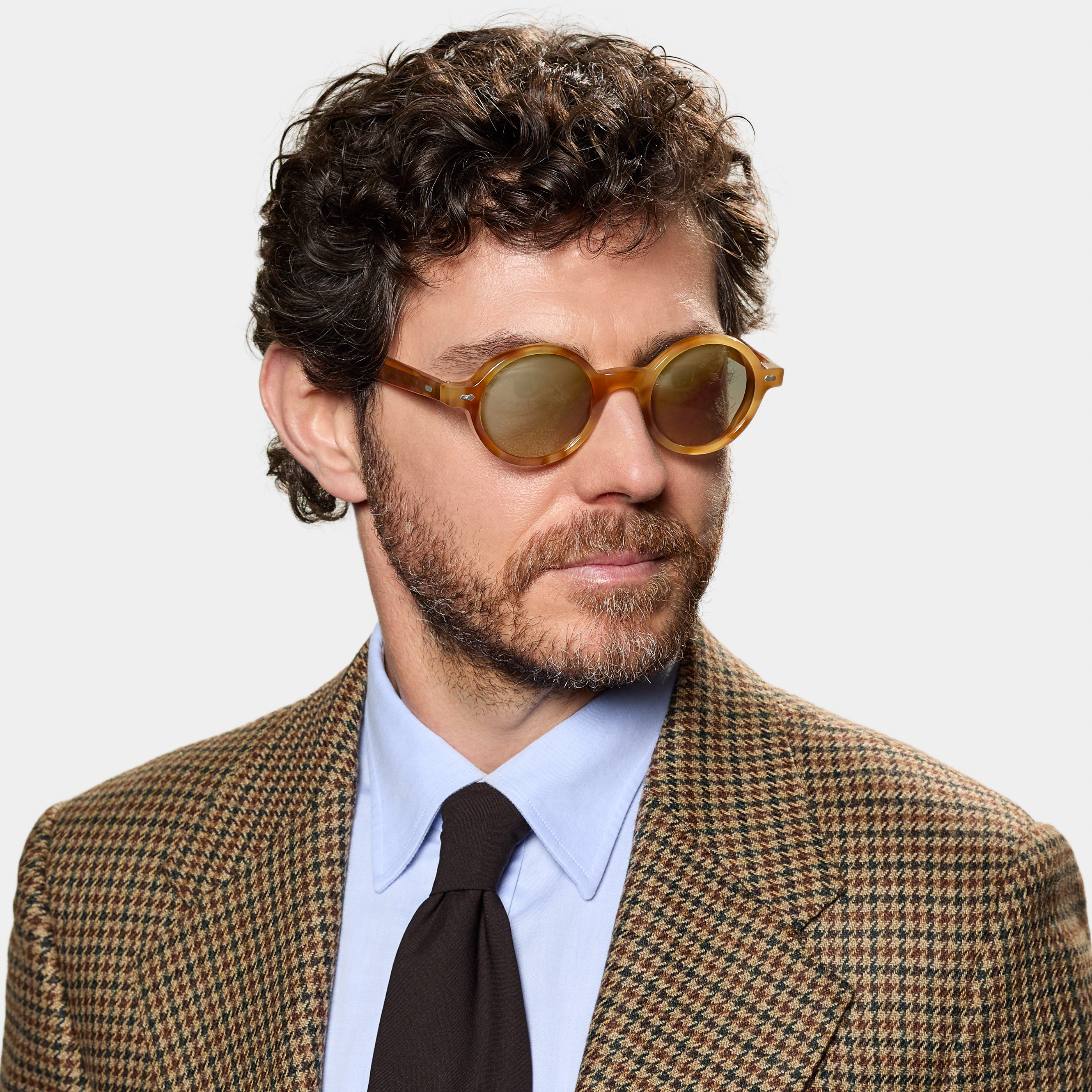 A person wearing Giotto Golden Havana sunglasses in sustainable bio-acetate, featuring Mirror Green lenses by TBD Eyewear, handmade in Italy. A person wearing Giotto Golden Havana sunglasses in sustainable bio-acetate, featuring Mirror Green lenses by TBD Eyewear, handmade in Italy.